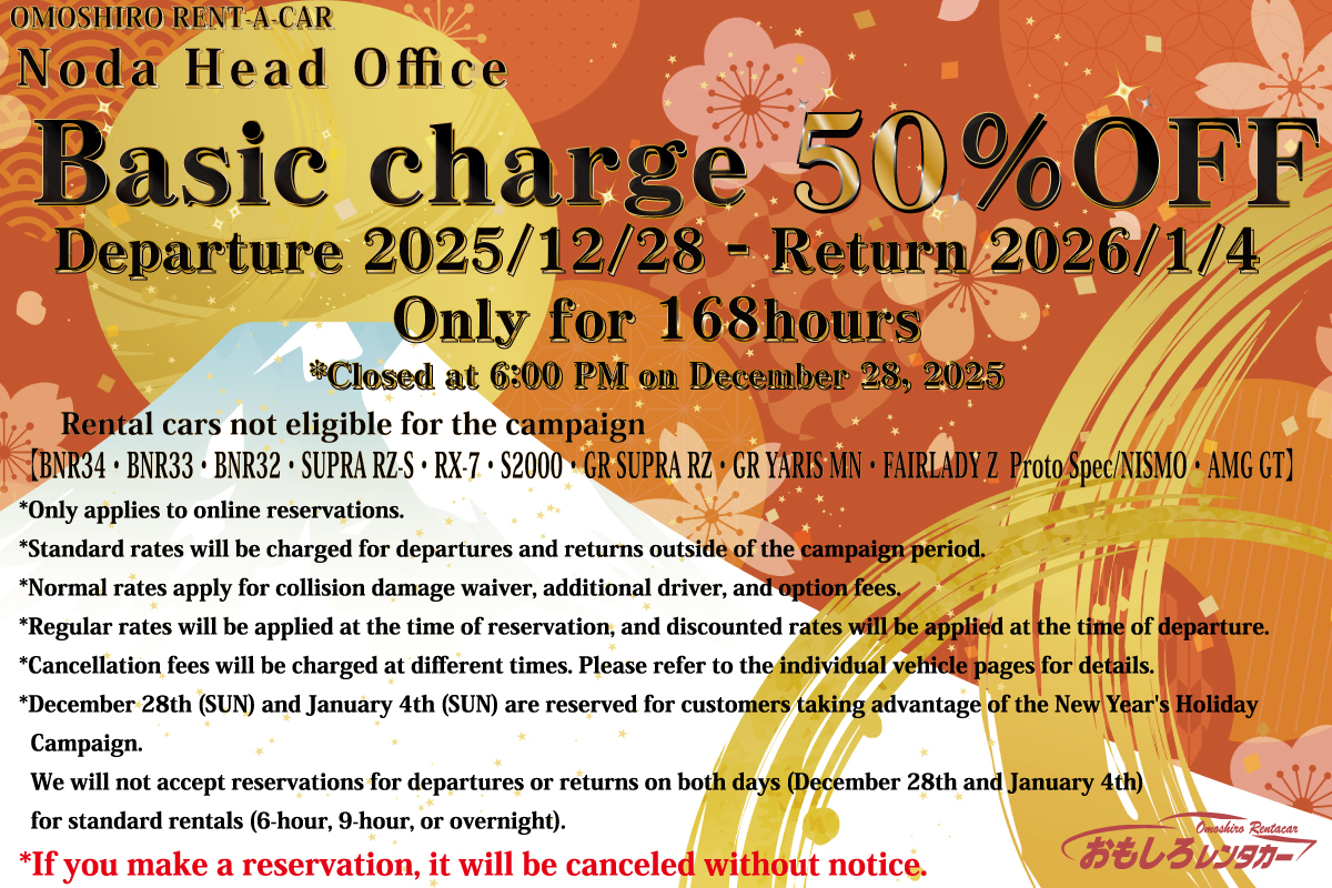 ※ 12/30(土)出発~1/3(水)返却のご利用で、基本料金が半額となります。