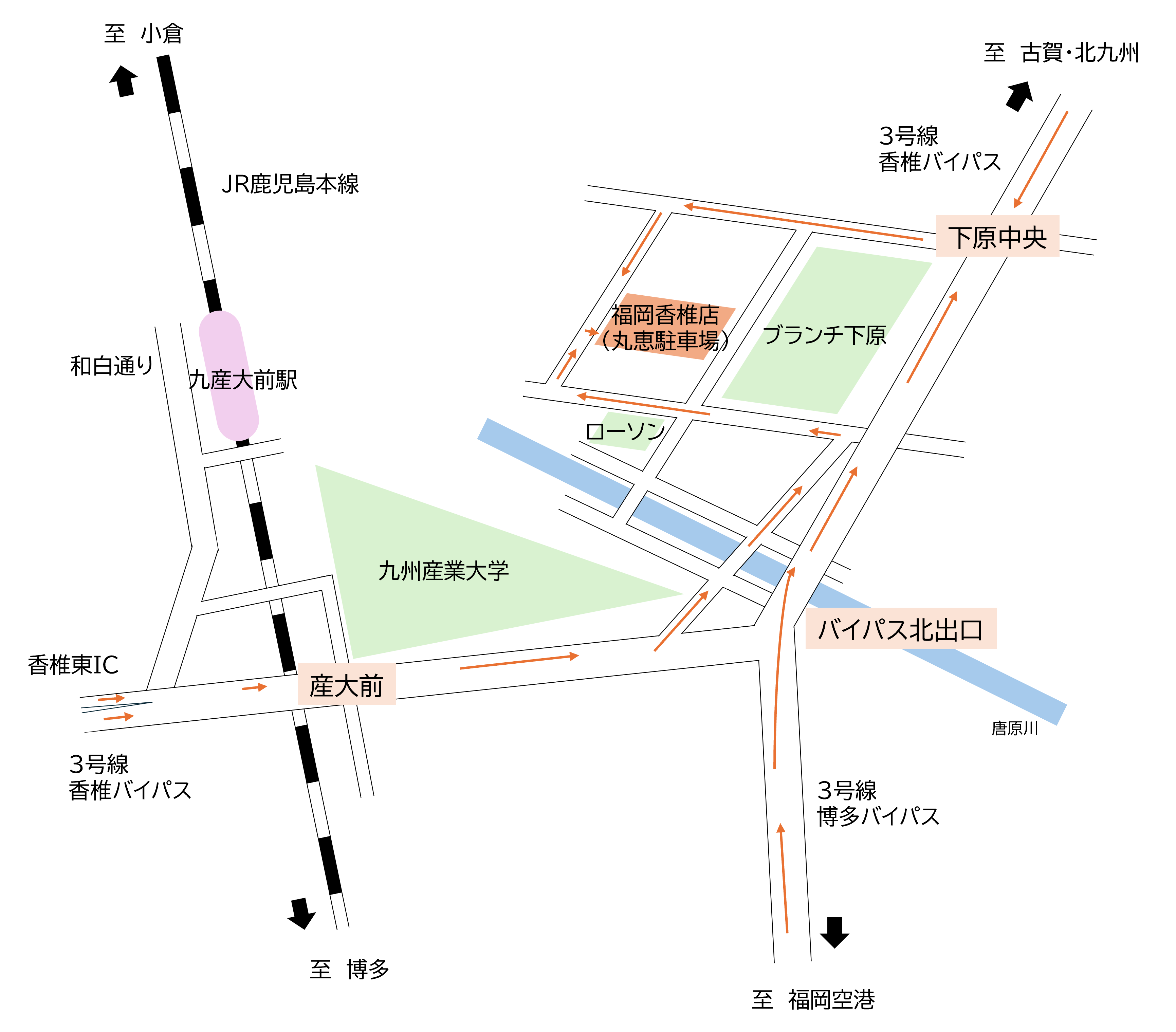 博多駅、福岡空港より約10kmほど北へ向かった場所に当店はあります。